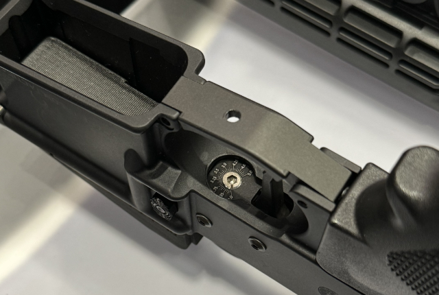 Adjustable drop in Trigger: Dieser Abzug kann in jedes AR-System eingebaut werden. Es sind keine komplizierten Maßnahmen erforderlich. Die im Bild zu sehende Schraube erlaube ein Verstellen des Abzugswiderstands von etwa 750 g bis 1800 g. Dieser Abzug fühlt sich sehr gut an. Aber es muss sich erst am Schießstand zeigen, ob das Vorteile bringen kann.